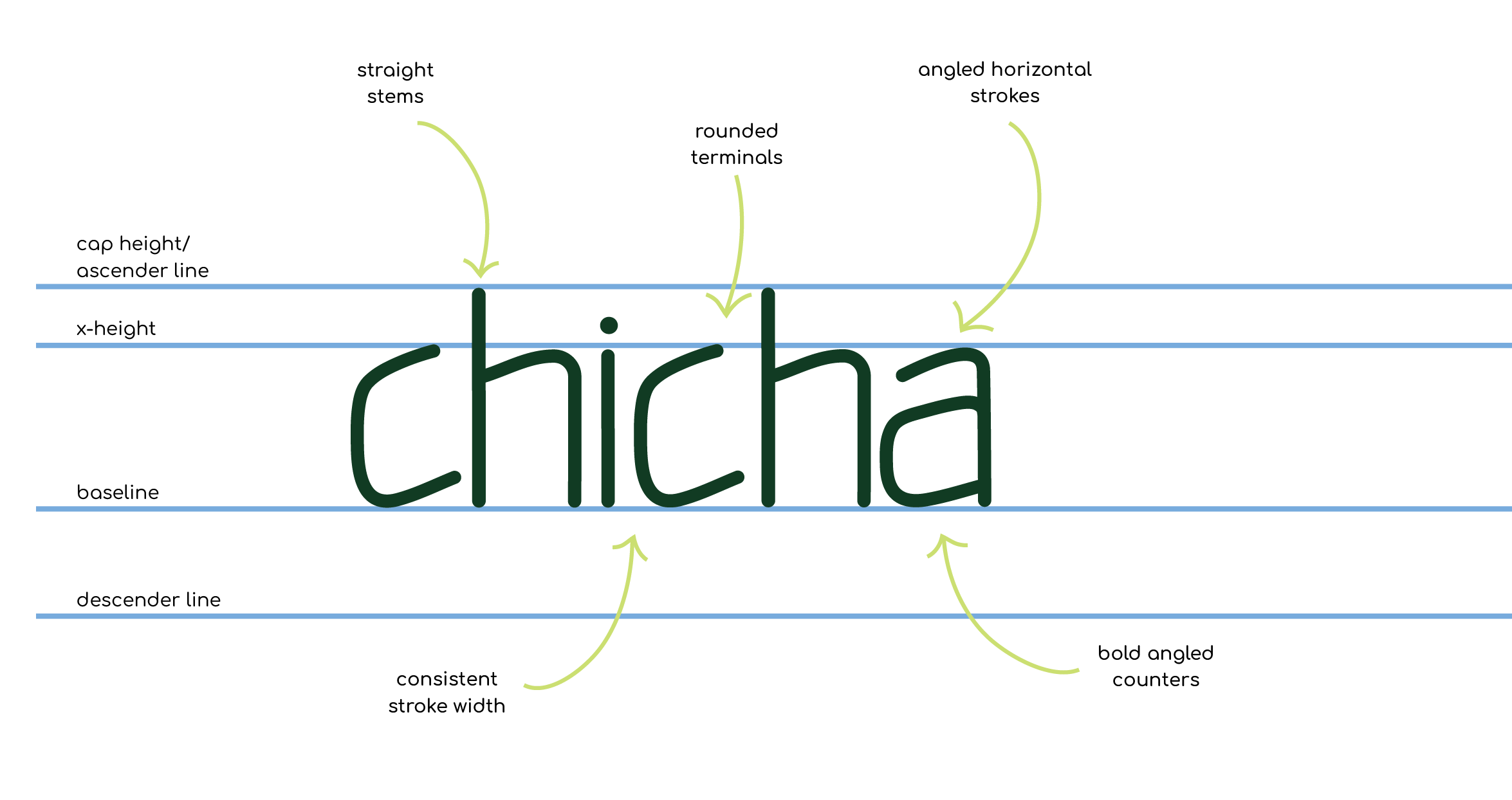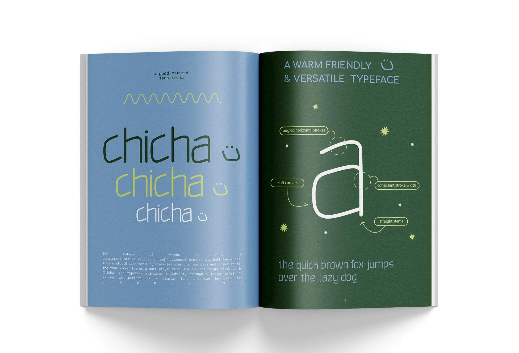 The final typeface is playful yet reliable—ideal for branding, packaging, and poster work. Rounded corners and open counters give it a soft, approachable feel, while angled strokes and consistent structure add strength and clarity—making it both expressive and functional. With its balanced proportions and easy legibility, Chicha brings a friendly human touch to modern typography while staying versatile across applications.