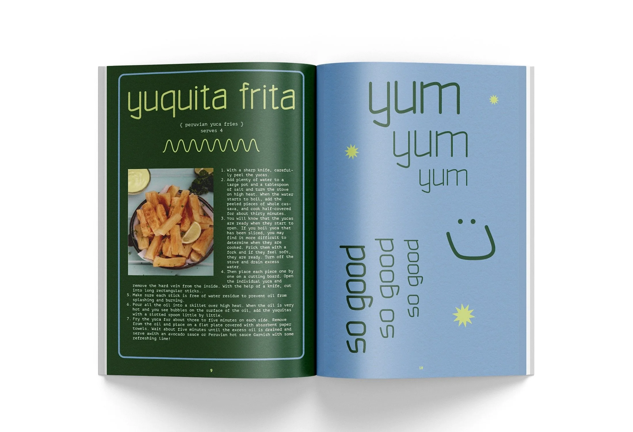 These pages display the characteristics and stylistic features of Chicha in real-world contexts, including headlines and body text. The layout serves as both a tool and visual narrative, showcasing Chicha's performance. Chicha is used as the header for a recipe in the second example, serving as a helpful example of how the typeface can bring warmth and personality to everyday content while remaining clear and approachable. This demonstrates its effectiveness in practical, content-driven design.