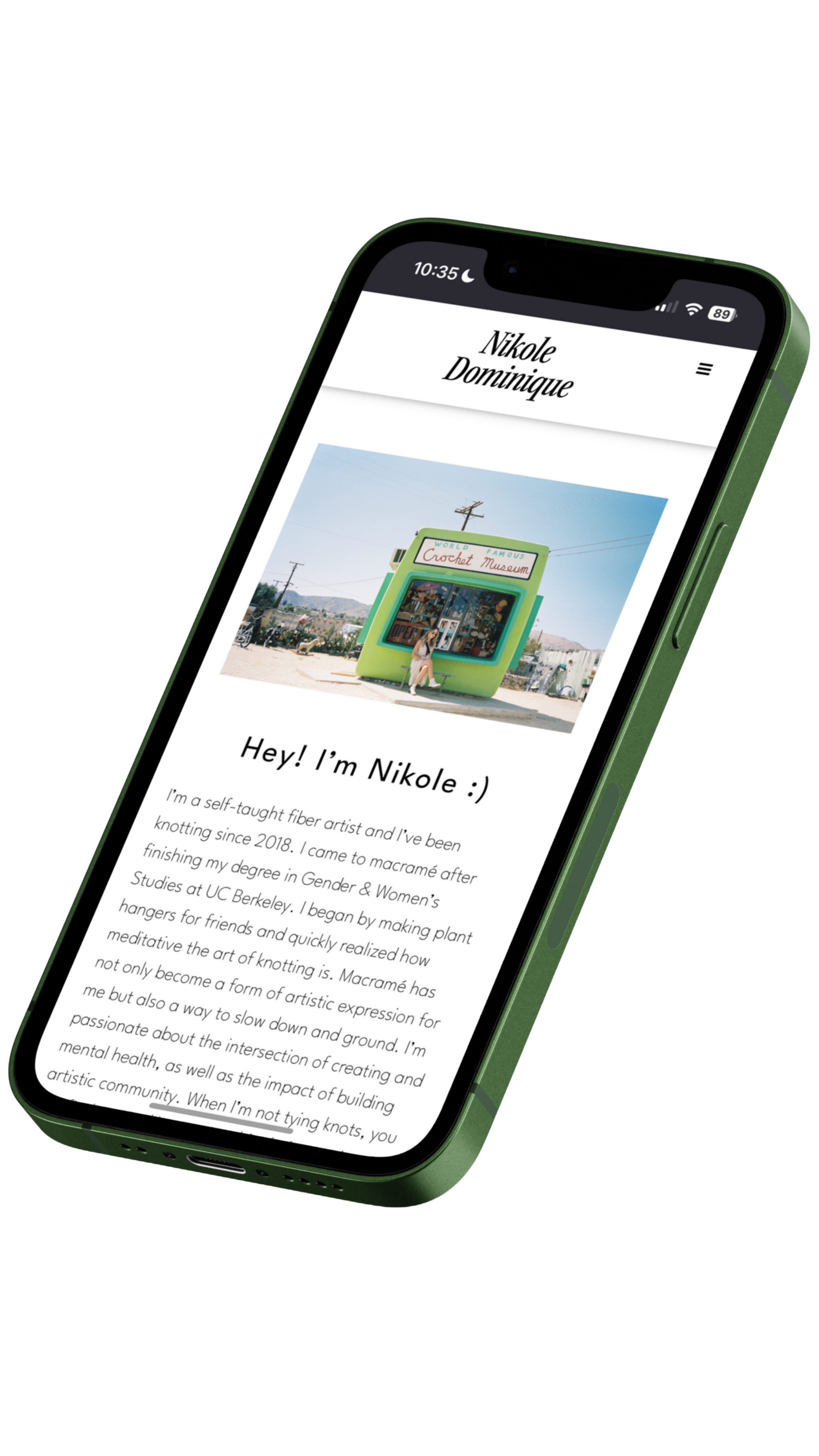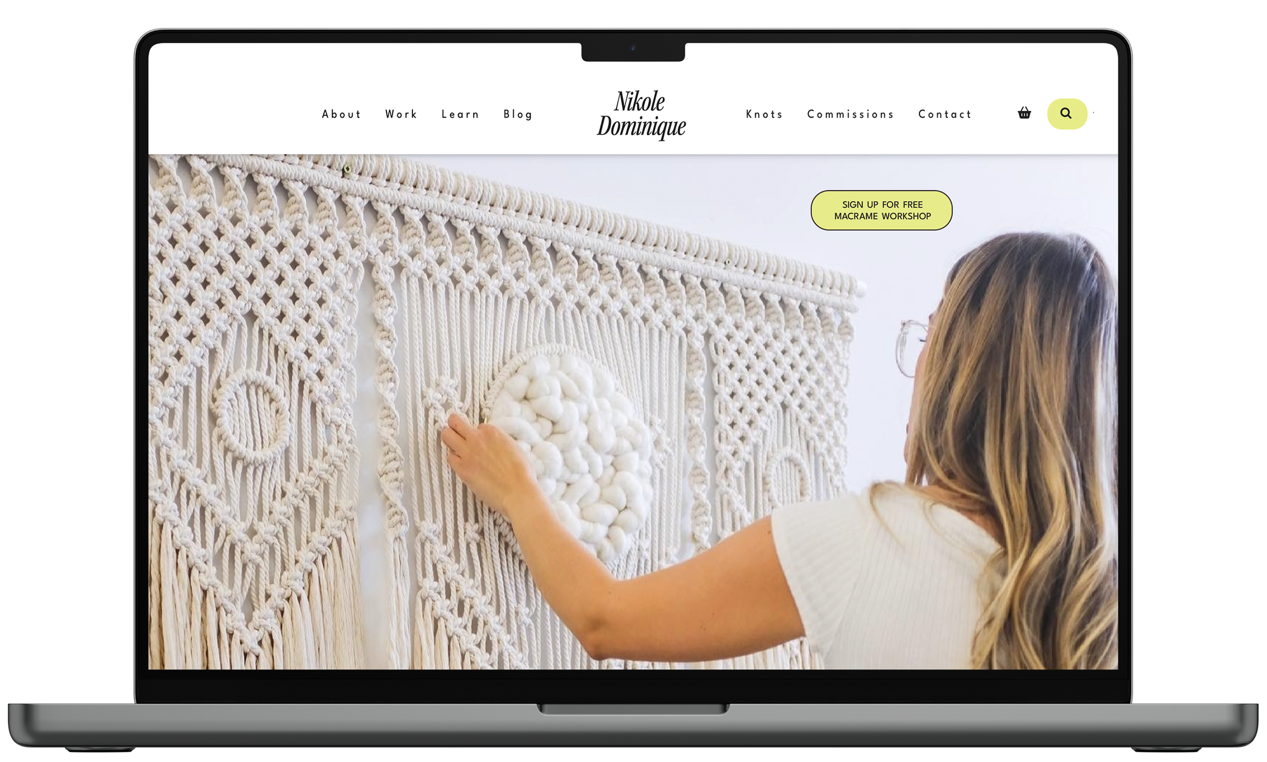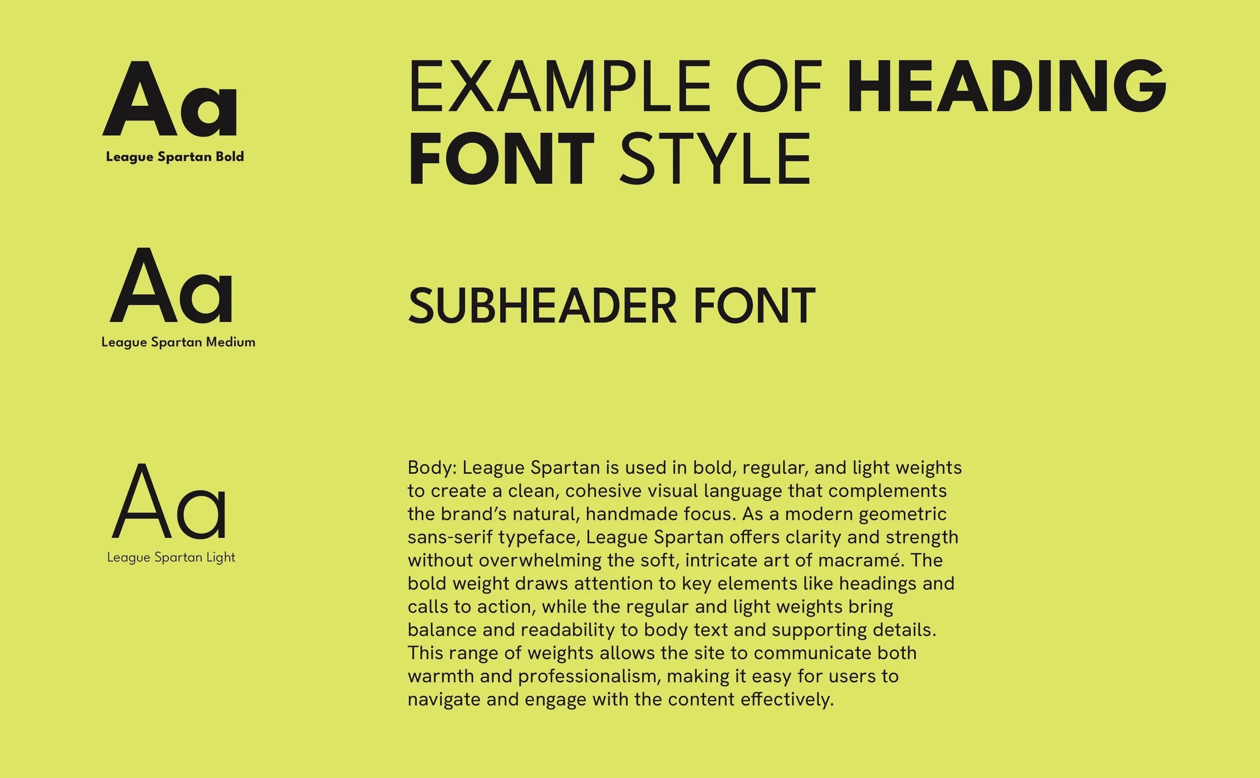 The website was built using HTML, CSS, and JavaScript with a customized W3 template, designed to highlight the artist’s work in a scrollable, user-friendly format. It includes eight pages covering the artist’s profile, macramé pieces, process, tutorials, blog, commissions, and contact info. A minimal, cheerful color palette and League Spartan typography create a visual hierarchy and maintain focus on the art. The overall design prioritizes clarity to create an engaging yet accessible portfolio.