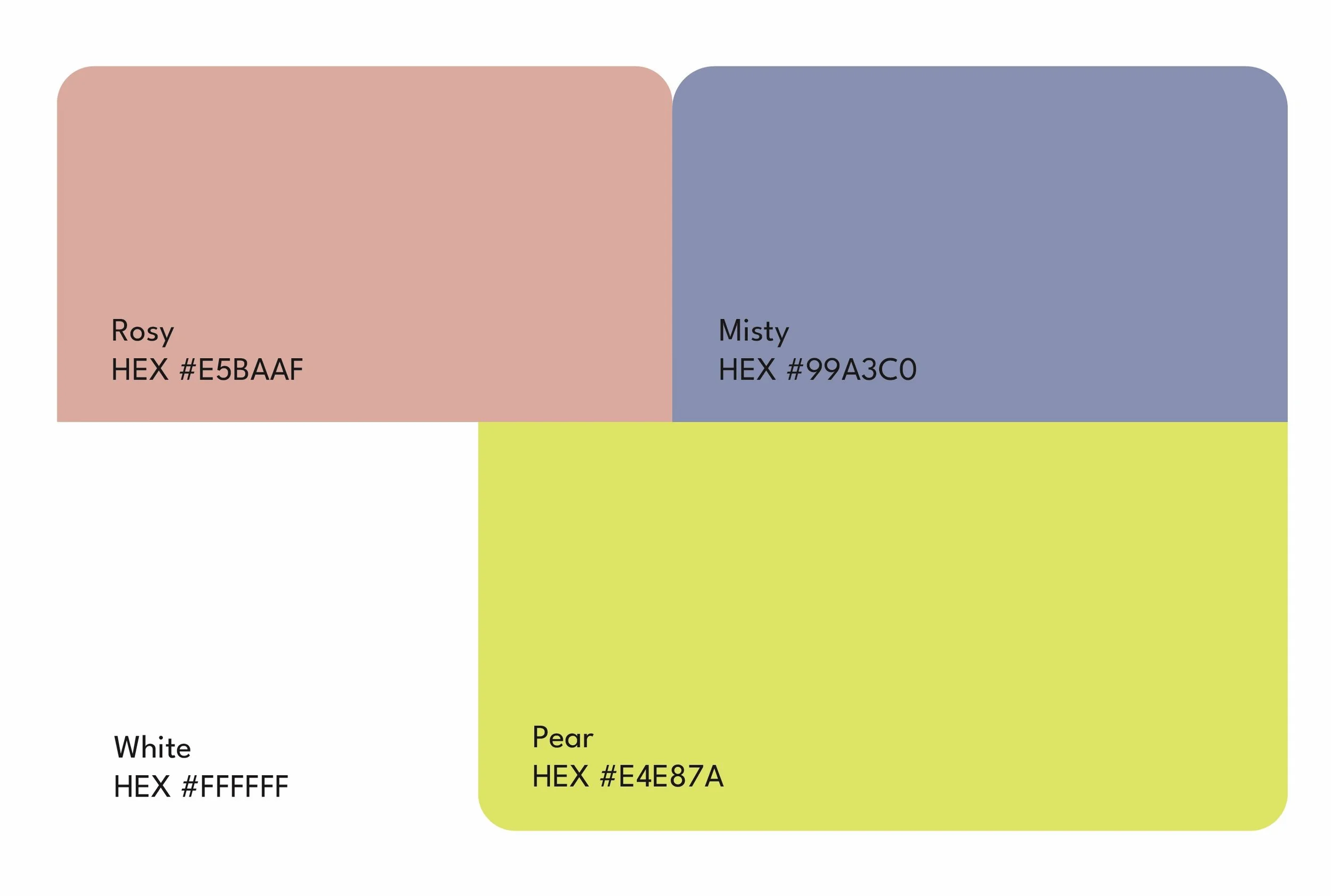 The color palette uses warm tones to create a welcoming atmosphere that complements the artistic and community-focused content. Rosy evokes warmth, comfort, and expression. Misty conveys trust, tranquility, and professionalism. And Pear adds a welcoming vibe full of energy and optimism.