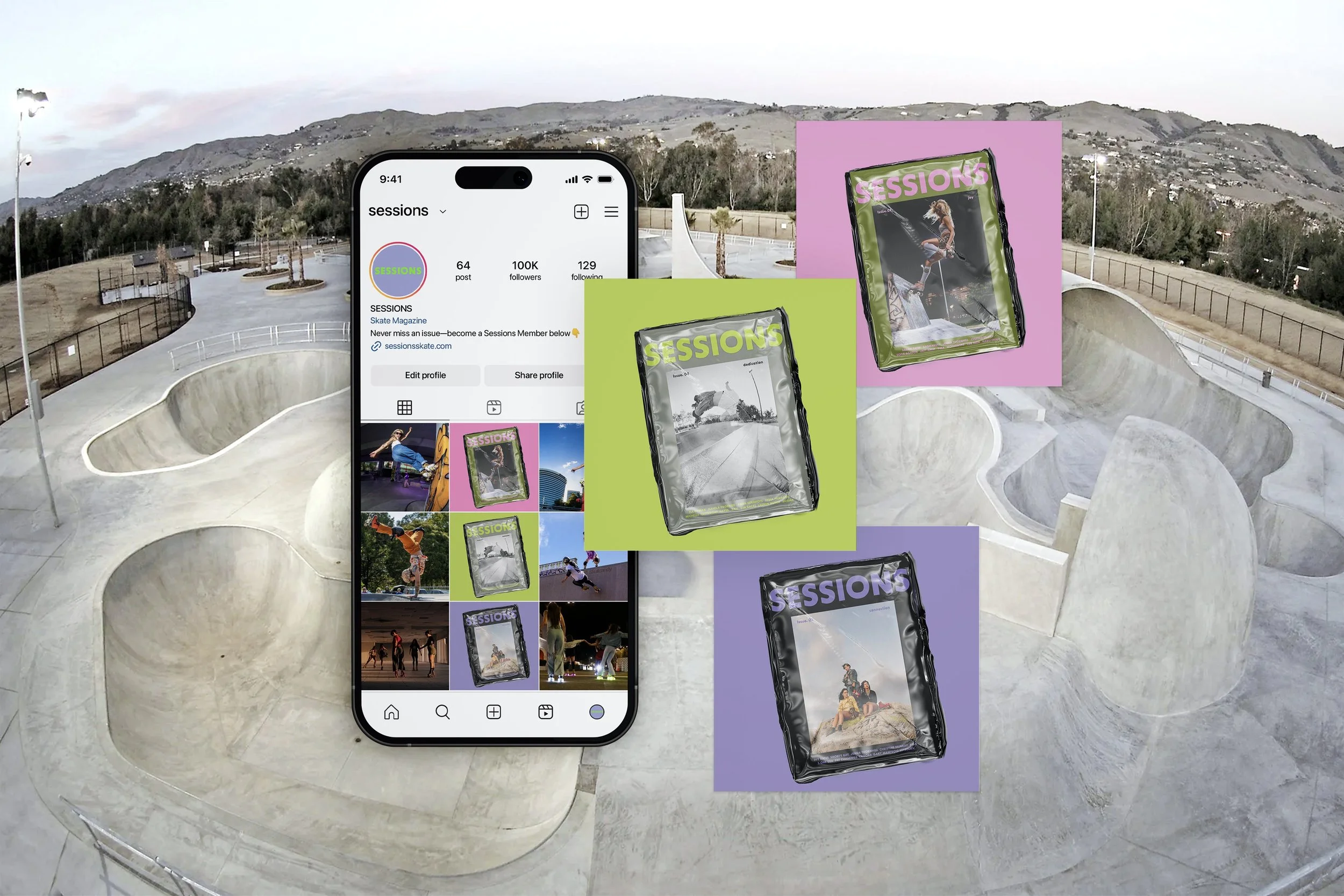 Creating a social media account for Sessions extends the magazine’s visual language beyond print, offering a dynamic platform to showcase each issue’s theme and featured skater. It allows the design system to live in motion, building a cohesive digital presence that mirrors the magazine’s tone. Social media also fosters community engagement, creating space for dialogue, inspiration, and visibility within the skating world and beyond.